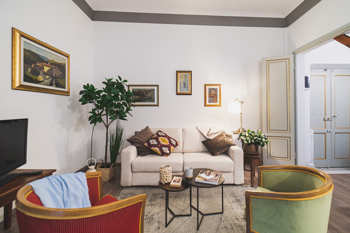This apartment, on the third floor of a building near the Ponte Vecchio and the Arno River, in the land of Florence. It has an unparalleled view of the city center on the central shopping street and the Holy Trinity Square. It is less than a 10-meter walk to the Cathedral of Santa Maria dei Fiori, Piazza della Repubblica, Piazza della Signoria and the Uffizi Museum. The apartment is located in ZTL but is only a 10-minute walk from the S. Maria Novella train station.