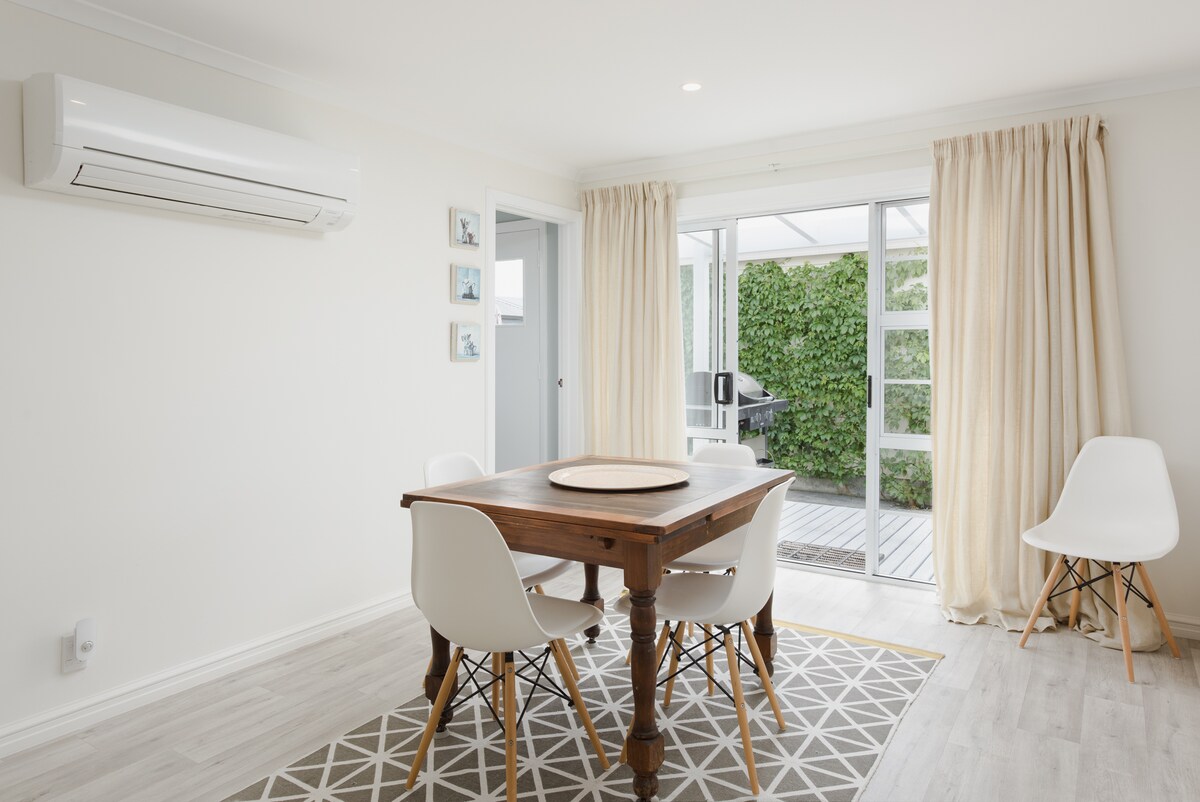 Located by the river, it offers a rural feel whilst being a stones throw to Blenheim CBD. With 3 bedrooms, two bathrooms, and spacious indoor relaxing areas it’s great for a family. A highlight is the outdoor area with covered patio with outdoor dining whilst looking over the river and green surrounds. A good amount of privacy ensures this accomodation feels at ease. Come and enjoy a full house rather than the usual smaller motel/hotel accomodation. BRAND NEW BATHROOMS!! DUCTED AIRCON!!