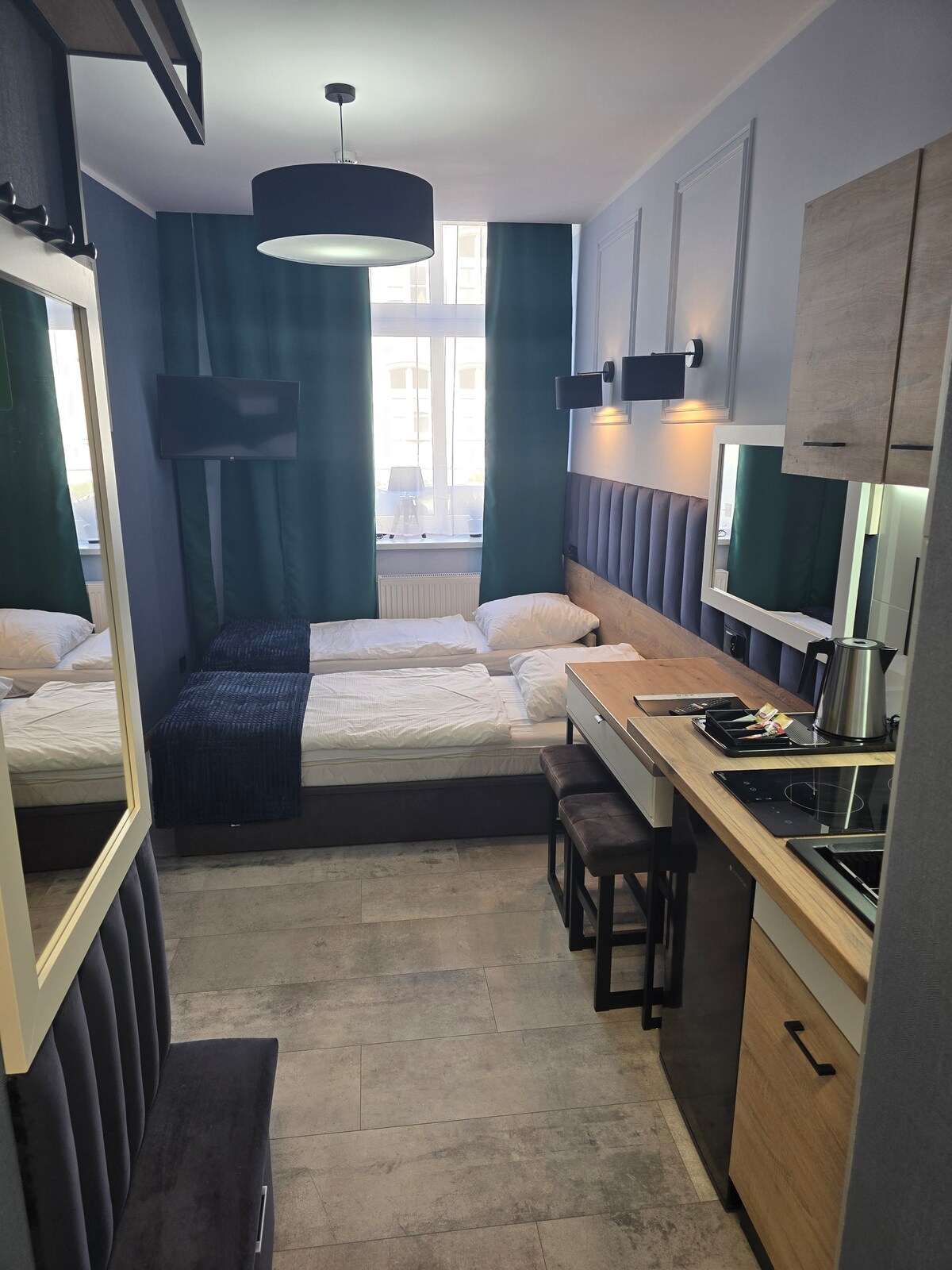 Do dyspozycji gości oferujemy apartament typu studio znajdujące się na pierwszym piętrze z wyposażoną w pełni kuchnię , ekspres do kawy, kuchenkę mikrofalową,zmywarkę,czajnik,płytę indukcyjną lodówkę . W łazience prysznic z deszczownią ręczniki,pościel ,środki kosmetyczne i czystości. Wi-FI bezpłatne.W osobnym pomieszczeniu znajduje się pralka z suszarką bębnową. Do obiektu wejście jest na kody które gość dostanie SMS w dzień przyjazdu.Zachęcam do rezerwacji :)serdecznie zapraszam