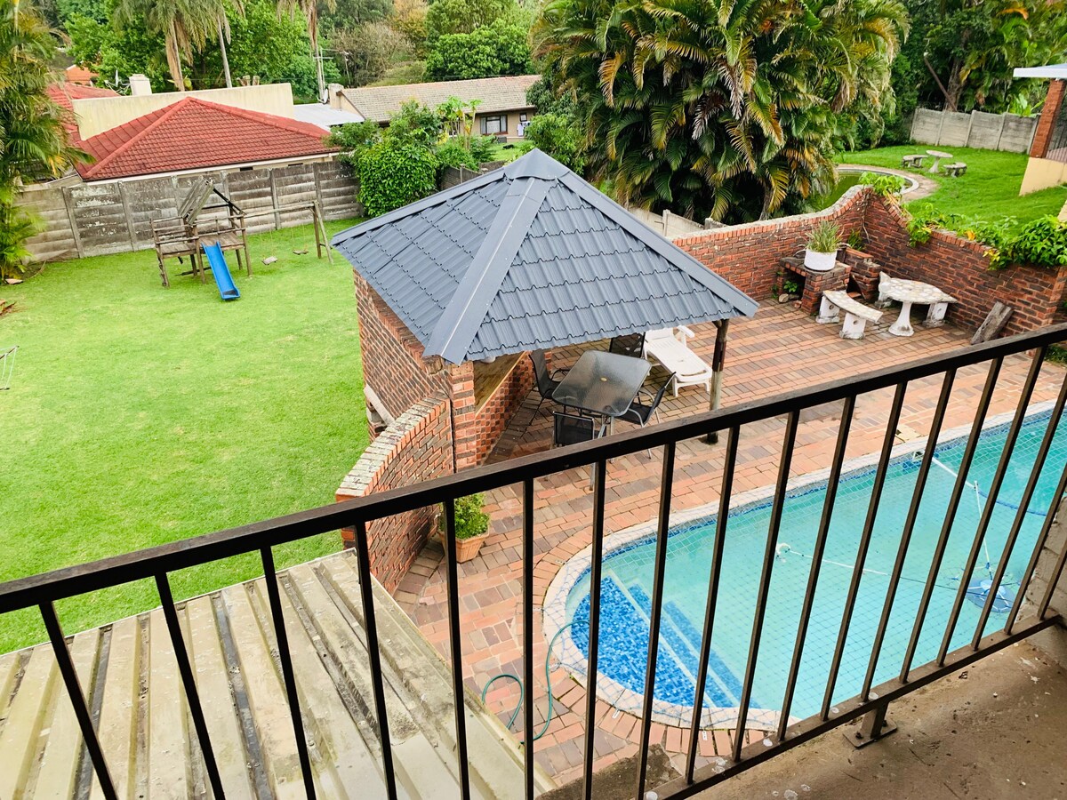 Private spacious room with queen size bed, on-suite bathroom, built in cupboards, Samsung 50" UHD TV, uncapped fibre, desk for working and mini kitchen with basic essentials, microwave, fridge and kettle. Peaceful environment, lush gardens with an abundance of bird life. Close to Hillcrest, Kloof, Assegai, Botha's Hill & Waterfall. Great for couples, solo adventurers and business travelers. Generator for when there is load shedding and safe parking on the premises.