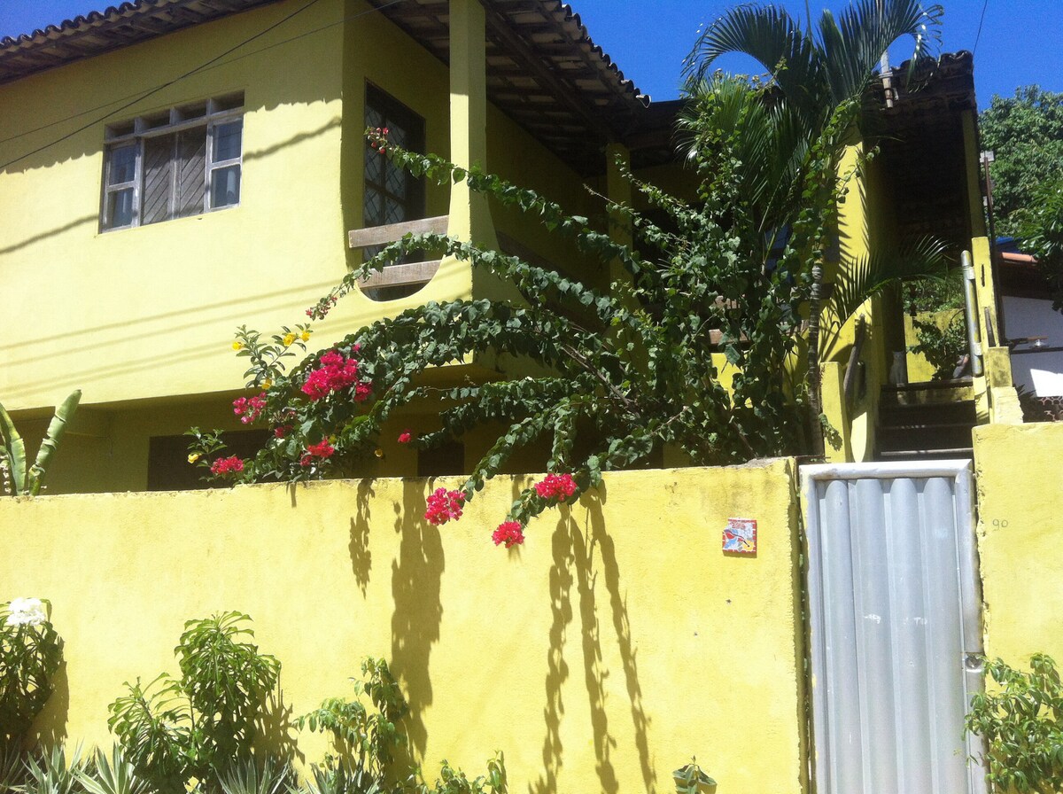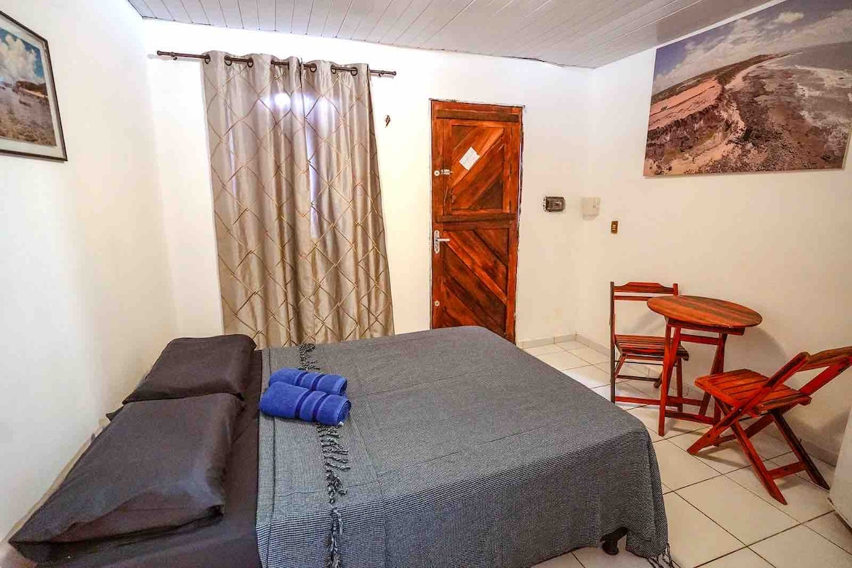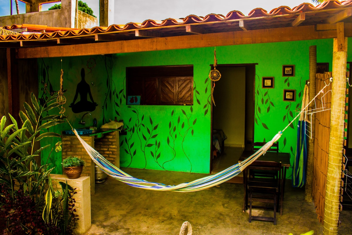 Suíte especialmente para casais, localizado em área super arborizada e tranquila, suíte com cama queen, ar condicionado, frigobar, TV, banheiro bancada pia dupla com chuveiro quente e varanda. Espaço para relaxar com uma fonte no jardim. Para uso comum, espaço lazer com grande mesa, som, freezer, churrasqueira, fogão, banheiro e um chuveirão externo. Distância do centro (e praia) 1km, Praia do Amor 1,5km, Praia do Madeiro 3,5km.