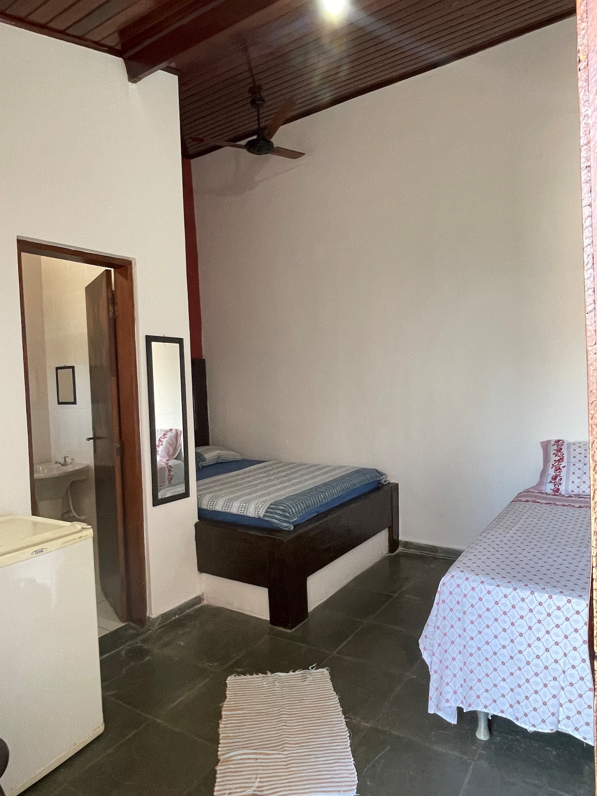 Quarto casal: Cama casal, banheiro privativo, TV, ventilador de parede, frigobar.