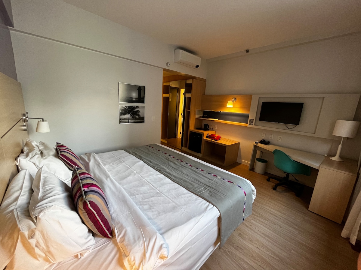 Apartamento mobiliado, apenas 230 metros da praia, menos de 3 minutos a pé. Roupa de cama, toalhas, ar condicionado, TV a cabo, wi-fi, cofre digital, secador de cabelo. Acomoda confortavelmente 4 pessoas, com uma cama de casal no quarto e um sofá cama na sala. Para maior conforto, o Flat conta com recepção 24 horas facilitando o check-in ou check-out, excelente café da manhã (pago a parte), piscina, academia, estacionamento com manobrista e limpeza diária, exceto domingos e feriados.