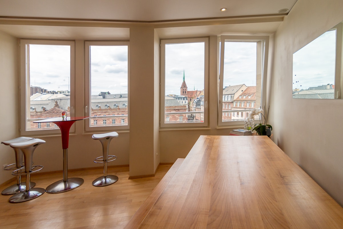 Beautiful spacious loft in the very heart of Strasbourg, on the top floor of a historic building with panoramic views over the city's main square - Place Kleber. It is ideally located to enjoy in tranquility the vibes of the old town and Strasbourg's main Christmas tree if you are visiting in winter. Bright, modern, and spacious. Fully equipped with everything you might need and surrounded by countless restaurants, cafés and main shopping area.