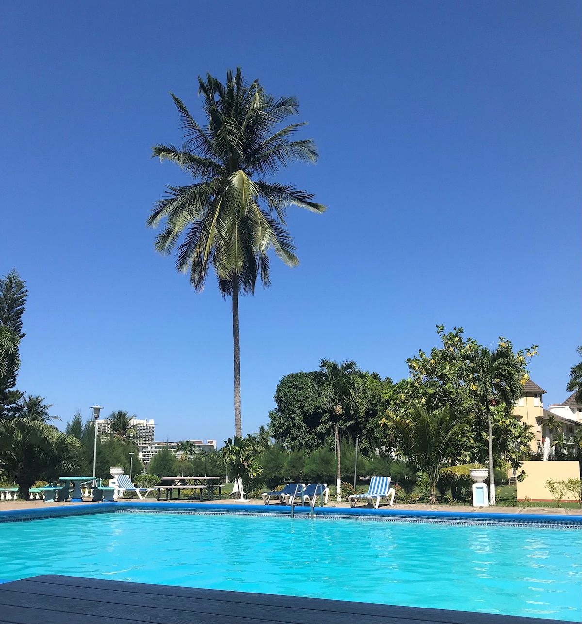 Modern contemporary self-catering studio apartment based on the 7th floor available in a gated community in Ocho Rios, with private entrance, own kitchen bathroom and free parking. This apartment DOES NOT HAVE A BALCONY. However, has a lovely view of the mountain and beach, pool terrace with free sunbeds, and free access to the lovely Ochio Rios beach.