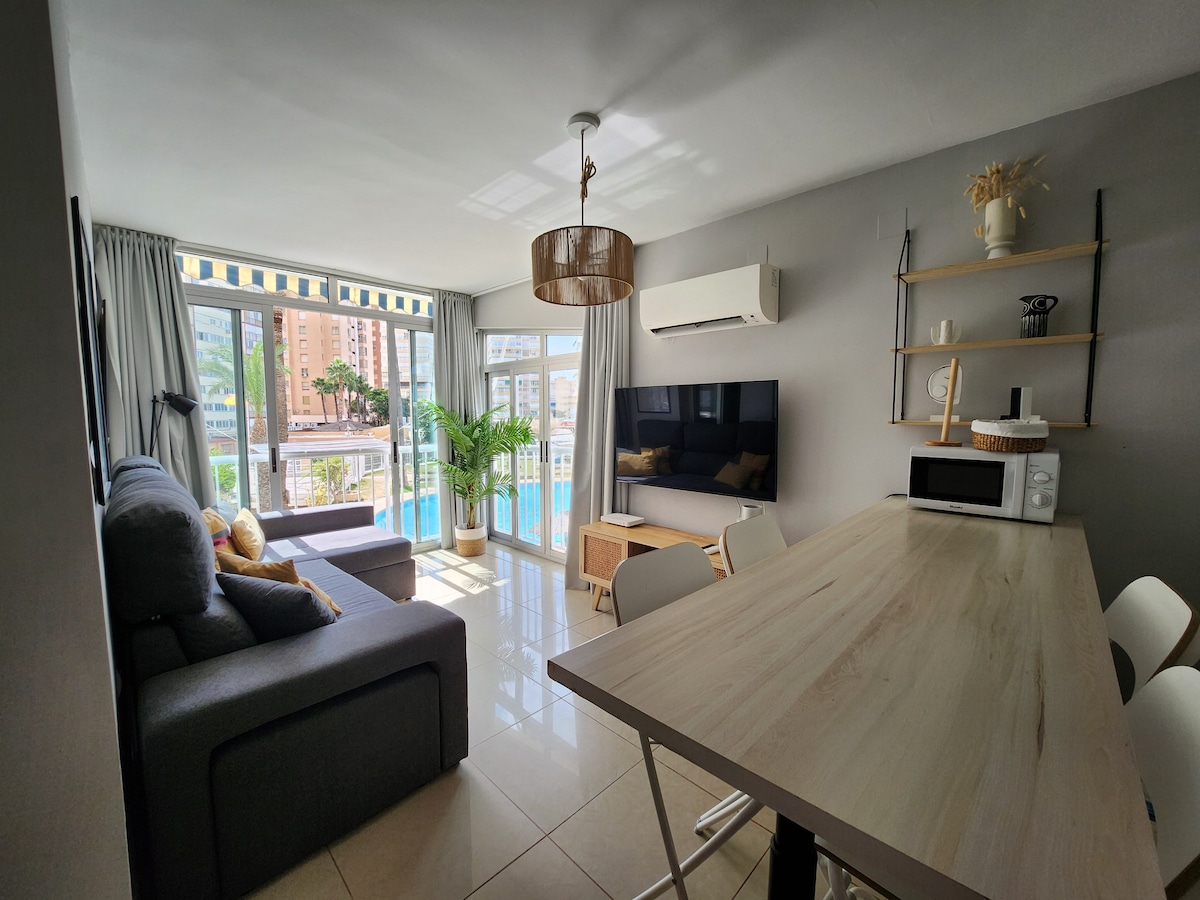 완전히 개조된 아파트로 2명에게 이상적이며, 매우 밝고 레반테-포니엔테 해변, 항구, 성 또는 바스크 지역에서 불과 300미터 거리에 있습니다. 베니돔 중심부에 위치하지만 평온한 분위기이며, 도보로 5분 이내 거리에 모든 서비스 (슈퍼마켓, 버스, 택시, 공원, 바, 펍, 레스토랑) 가 있습니다. 에어컨이 갖추어져 있으며, 주방이 있는 더블룸, 화장실, 거실이 있습니다.