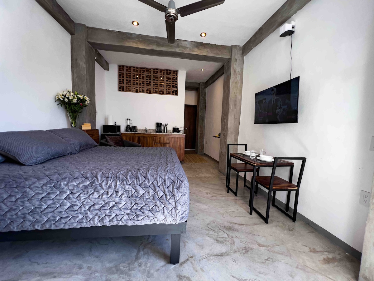 Enjoy an amazing stay in Studio Paraguay! Located in the authentic central PV neighborhood of 5 of December, you're 1/2 blk to beach, and a short walk to the famous malecon promenade. You'll be surrounded by authentic restaurants and locally sourced coffee shops. You're staying on one of best secret streets in PV. Your home away from home is a LEED style spacious modern studio full of light recently constructed by artisanal laborers of ecologically responsible materials with modern amenities.
