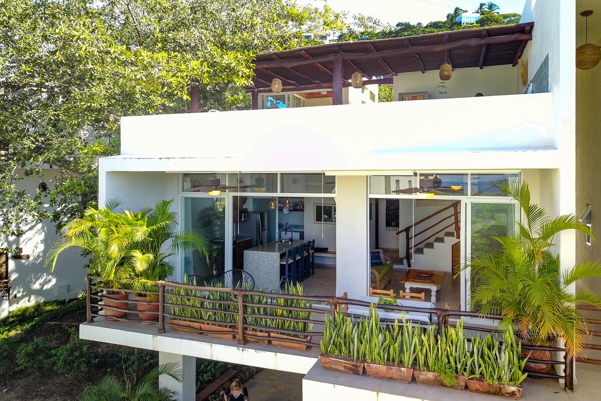 A ocean-view, modern and fully equipped 3 bdr, 3 bath terraced condo in a lush safe complex--1 block from the clean uncrowded side of Sayulita beach. Infinity pool w/ ocean view; high speed fiber optic wifi, the only tennis court in Sayulita; a private shady roof terrace & outdoor kitchn w/ surfbreak and Monkey Mountain vviews, 65"TV, a/c, indoor kitchn, washer/dryer, dedicated car parking spot, house golfcart with in-complex parking for rent, solar powered--3min walk to beach and 10min to town