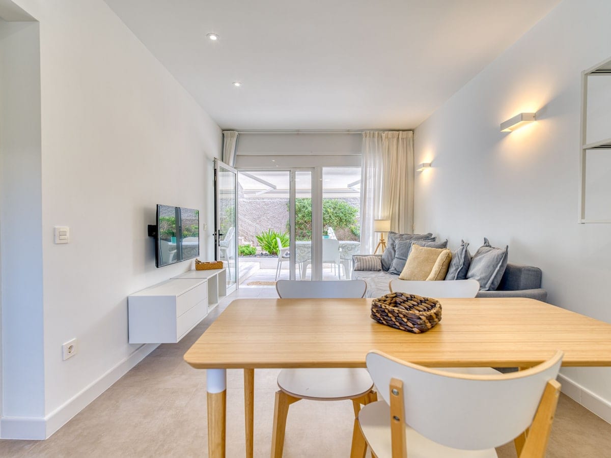 Amapola Palms is a seafront apartment with a unique style inspired by 1950s Palm Springs architecture. Located on the ground floor, it offers direct access to the seaside promenade and pleasant ocean views. Its private terrace with outdoor furniture is perfect for relaxing, sunbathing, or enjoying meals outside. An ideal option for couples or families with children looking for comfort, design, and a prime location by the sea.