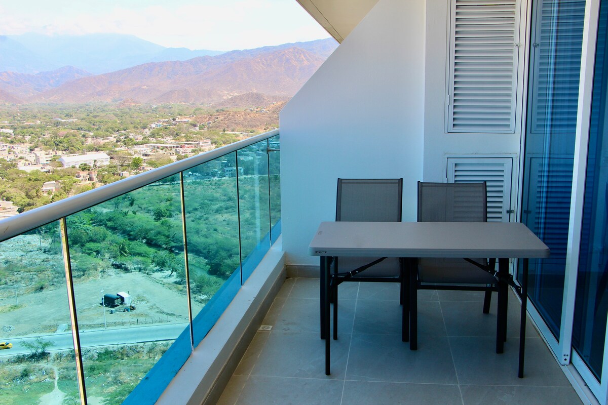 Luxury suite with a jacuzzi on the balcony. It is located in the best and most exclusive area of Santa Marta. It is next to the Hilton Hotel, Irotama Hotel, and Mercure Hotel. It has everything you need to enjoy an unforgettable vacation. The kitchen is fully equipped with a refrigerator, induction stove, pots and pans, coffee maker, kitchen utensils, microwave, and air fryer. It is 8 minutes from the airport and very close to Zazue Mall shopping center.