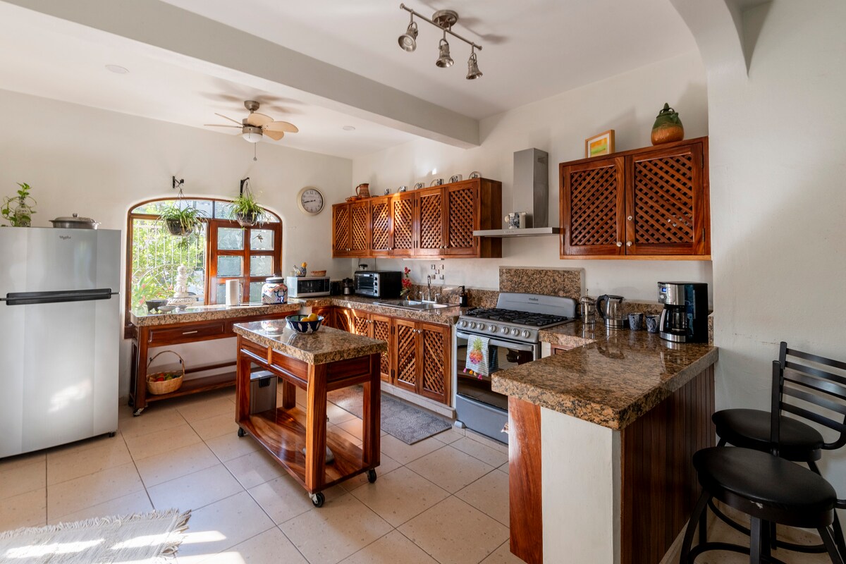 현대적인 비치 하우스, 많은 일광, 프라이빗, 조용하며, 메인 스퀘어 뒤에 위치하고 있으며, 해변에서 두 블록 떨어져 있으며, 아름다운 정글과 일몰 전망, 수영장, 정원, 펑키하고 편안합니다. 모든 주요 비즈니스에서 2~3블록 거리(마을과 해변까지 도보 거리)에 있지만 조용한 동네에 있습니다. 저희는 예술와 디자인을 사랑하기 때문에 따뜻한 숙박을 위한 디테일로 둘러싸인 아늑한 숙소의 느낌을 받으실 수 있습니다. 휴가나 장기 숙박에 적합하며 위성 인터넷 서비스를 통해 원격으로 일할 수 있습니다.