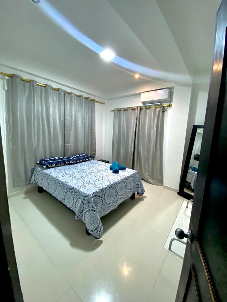 Tu familia estará cerca de todo cuando te quedes en este espectacular apartamento, con variedad de restaurantes y playas cercanas. Cuenta con dos habitaciones, una con cama Queen, baño privado, Tv con cable, Wifi, closet y aire acondicionado. La segunda habitación con tres camas sencillas, Tv con cable, closet y aire acondicionado. Una espectacular sala comedor con vista panorámica, la cual cuenta con dos camas sencillas, un sofacama, cocina equipada, baño completo y aire acondicionado.