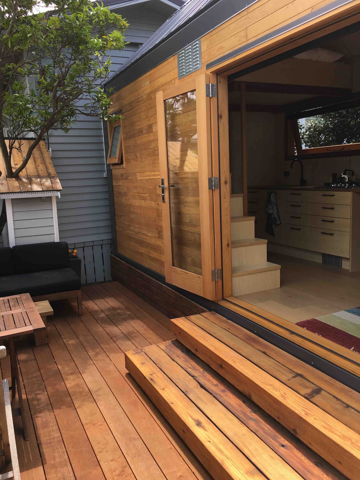 해변과 카페 근처에 위치한 새로운 건축 디자인의 친환경 초소형 주택입니다. 이중 유리 시더 프렌치 도어는 주방과 거실에서 야외 식사를 즐길 수 있는 전용 데크로 원활하게 이동할 수 있습니다. 게스트는 데크에서 식사를 즐기며 야외 소파에서 휴식을 취할 수 있습니다. 정원 환경에 위치한 이 숙소는 친환경 화장실, 무제한 와이파이, 샤워기, 냉장고/냉동고, 주방이 갖춰져 있습니다. 최대 2명까지 수용할 수 있습니다.