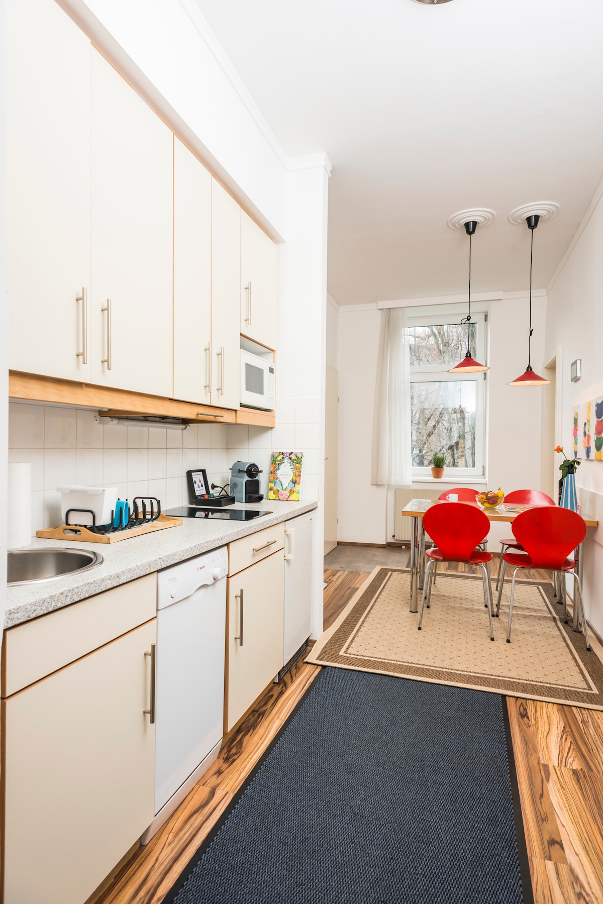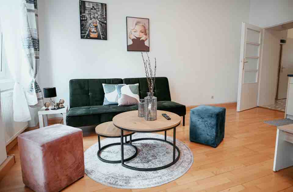사랑스럽게 가구가 배치된 아파트는 45평방미터이며, 160x200 더블 침대가 있는 침실, 풀 아웃 소파 베드가 있는 거실, 주방, 욕실이 있습니다. 이 아파트는 9구역에 위치하고 있으며, 지하철역 너스도르퍼슈트라세 맞은편에 있습니다. 지하철이나 트램을 타고 15분 이내에 시내에 도착할 수 있습니다. 여러 아파트가 포함된 아파트 카테고리입니다. 이 카테고리에서 아파트 1개를 예약하셨습니다.