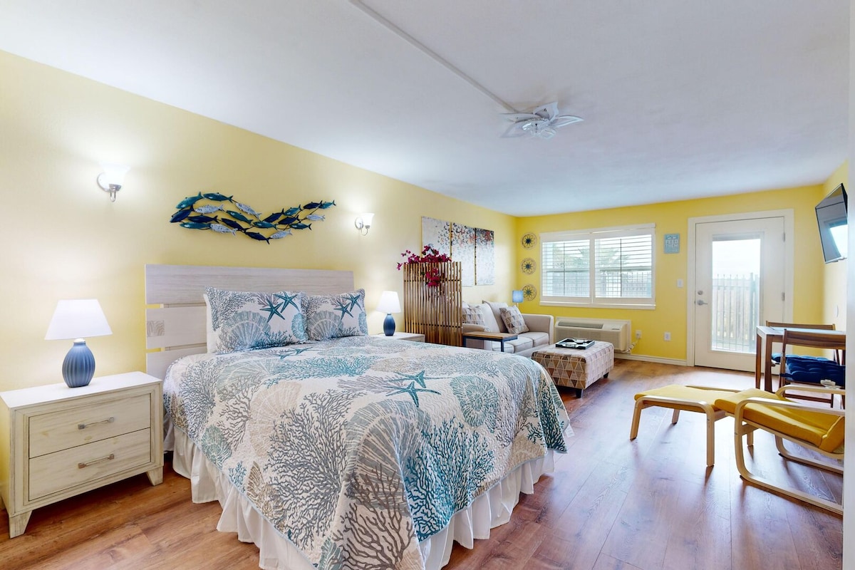Experience a serene getaway in this newly remodeled, first floor studio on North Padre Island only a short 5 minute walk to the beach. This cozy cottage features a timeless and beautiful design, including a king size bed and queen sleeper sofa accommodating up to 4 guests. You will also enjoy a full kitchen, bathroom, dining and living area with 4K TV. There are many shared condominium amenities to include pool, hot tub, sauna, gym, bbq and more. Enjoy a serene beach getaway today!