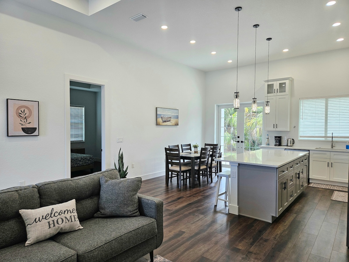 이 아름다운 해안가 전원주택에서 느긋한 플로리다 라이프스타일을 즐겨보세요. 이 새로 지어진 침실 2개 욕실 2개의 숙소는 노스 포트와 포트 샬럿 근처의 중심부에 위치해 있으며, 고속도로에 쉽게 접근할 수 있고, 쇼핑과 식사 장소까지 몇 분 거리에 있으며, 여러 멋진 걸프 코스트 해변까지 30분 미만 거리에 있습니다. 이 가구가 완비된 휴가지 임대 숙소는 6명이 편안하게 잘 수 있습니다! 참고: 허리케인 이안으로 인해 울타리가 없어졌습니다.