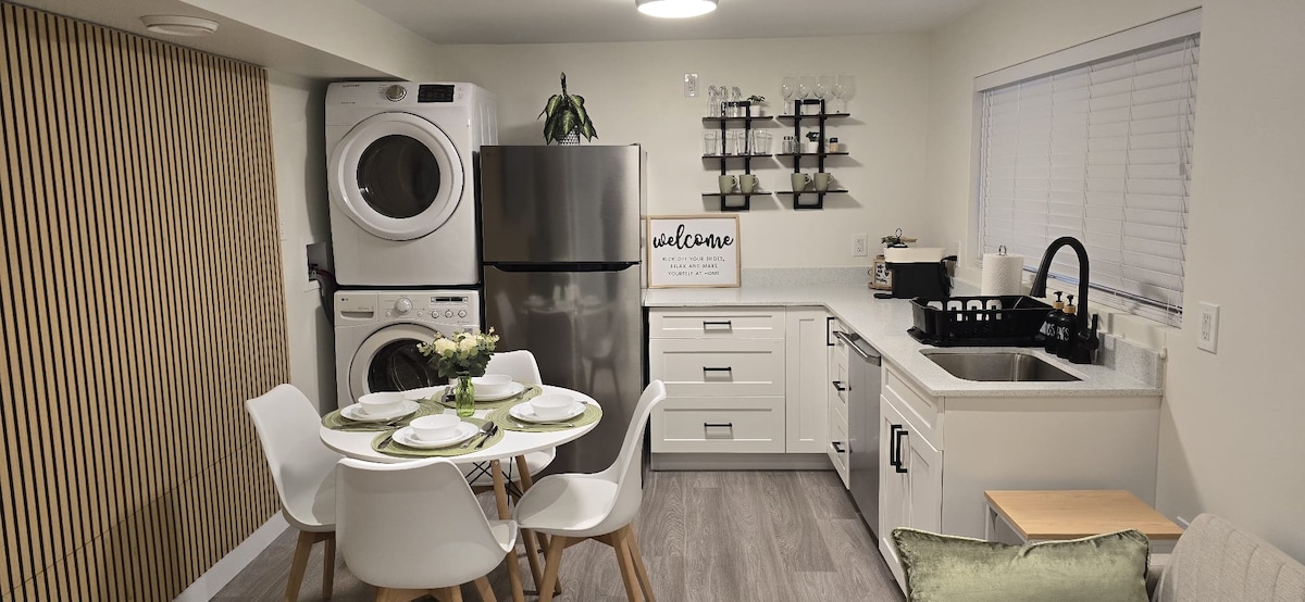 현대적이고 밝은 지하 스튜디오 퀸사이즈 침대와 소파 베드가 있습니다. 완비된 간이 주방에는 쿡탑, 전자레인지, 주전자, 조리기구, 식기류가 구비되어 있습니다. 대형 샤워실과 전용 세탁기/건조기가 있는 전용 욕실. SFU 근처의 조용한 동네에 위치하고 있으며, 도보, 대중교통, 자동차로 쉽게 이동할 수 있습니다. 밴쿠버 시내까지 차로 30분, 대중교통으로 45~60분 거리입니다. 깨끗하고 편안하며 모든 생필품이 구비되어 있습니다. 참고: 반려동물을 사랑하지만 고양이는 허용되지 않습니다.