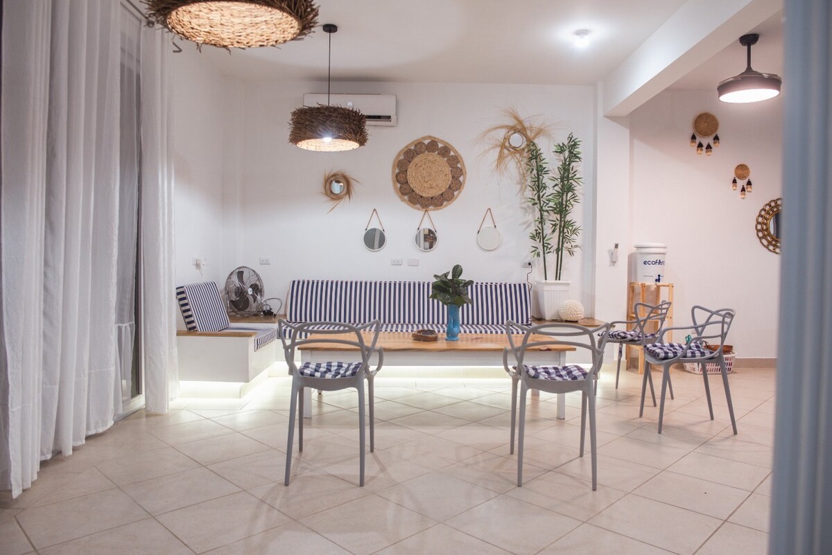 스타일, 우아함, 고급스러운 편안함을 갖춘 이 숙소에서 가족 모두와 함께 즐거운 시간을 보내세요. 바다 전망과 해변 바로 앞에 있는 수영장이 있는 우아한 장소에서 특별한 방식으로 일출과 일몰을 즐길 수 있는 경험을 해보세요. 깨끗하고 편안한 객실과 세르타 프리미엄 침대. 침실 3개(메인 1개, 세컨더리 2개), 욕실 2개, 에어컨, 거실, 와이파이, TV, 식당, 완비된 주방, 그릴이 있습니다.
