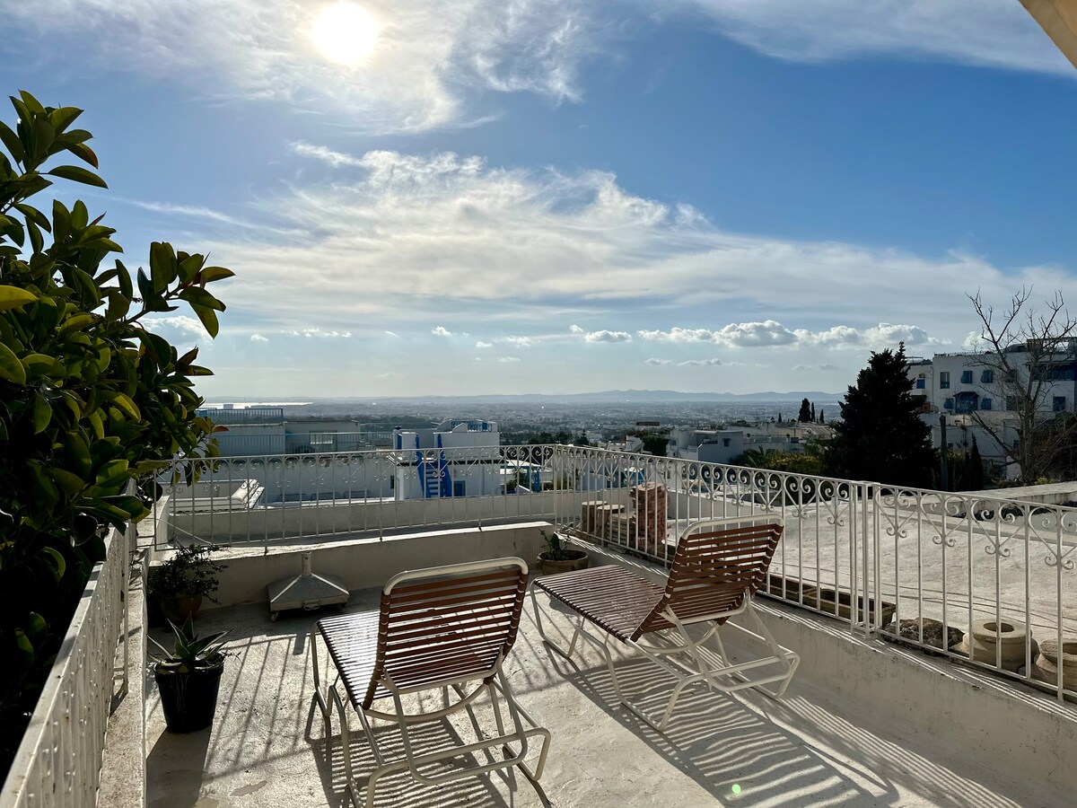 Un studio charmant pouvant accueillir 2 à 3 personnes. Vous y trouverez une grande terasse, pour des repas avec vue (barbecue ).Ce studio à la vue imprenable sur le Golfe de Tunis, se situe au cœur du village de Sidi bou Saïd. Vous aurez l'occasion de découvrir l'architecture unique de ce site inscrit au patrimoine mondial de l'unesco. Les maisons bleues et blanches,Le palais du Baron d'Erlanger, le café des délices chanté par Patrick Bruel, les vues uniques, seront tous au rendez-vous!
