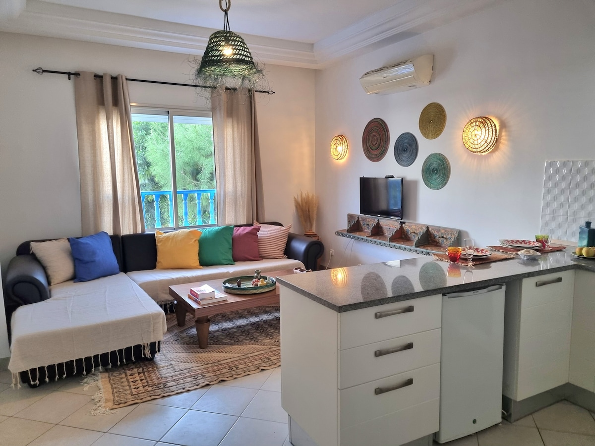 Appartement au cœur de Sidi Bousaid, joyeux, lumineux et confortable. situé à 5mn à pied de la gare du train dans un quartier résidentiel sécurisé à côté de toutes les commodités, épicerie, prunier, pharmacie. Tous les lieux d'intérêt de renommé de Sidi Bou Said, musée, monuments, café des délices, Café des nattes, restaurants,... sont visitables à pied. l'appartement est richement équipé, dispose d'une décoration authentique et typique réalisée par des artistes et materiaux 100%Tunisiens