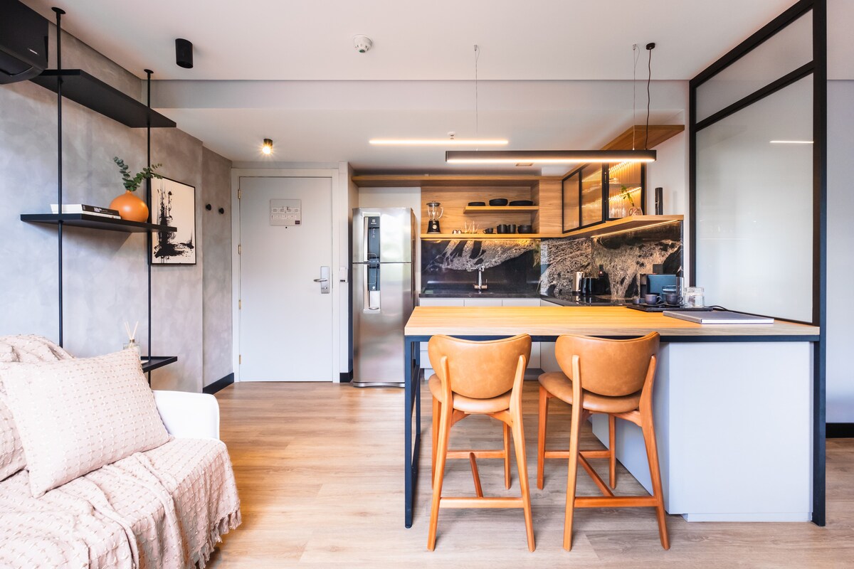 Viva uma experiência única neste estúdio acolhedor e elegante, projetado com atenção aos detalhes para oferecer conforto, funcionalidade e muito estilo. O ap azul planejado é um diferencial exclusivo, com iluminação suave e decoração pensada para relaxar, móvel inteligente e versátil que se transforma em mesa de jantar ou apoio para cozinhar — perfeito para quem valoriza funcionalidade. Piano digital disponível para relaxar, praticar ou se inspirar. Smart TV, Wi-Fi.
