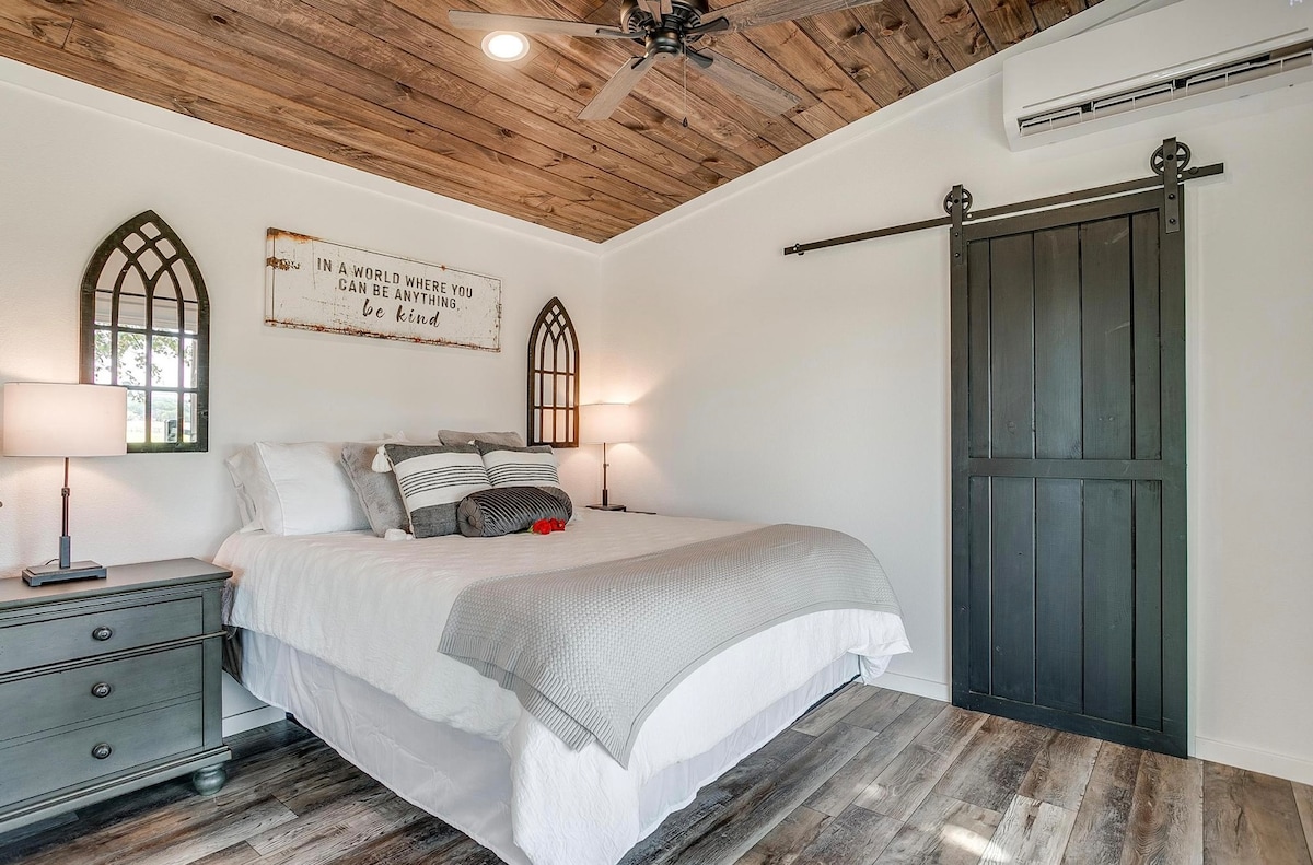 Close to possum kingdom Lake & Graham Lake , Fabulous deck minutes to the largest downtown square in Graham Texas . Minutes to young country arena ., Discover the gorgeous landscape that surrounds this place to stay under the big blue sky , big stars & listening to the coyotes sing . pet friendly to approved as we’re on a goat farm. Two identical bedrooms each with one double bed . Twin on top of each bed . Bring hammocks , personal grills , propane grill