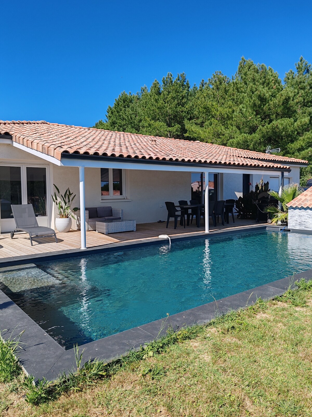 고풍스러운 석조 주택인 바스티드 내부에 위치하고 있으며 완전히 개조되어 밝고 편안합니다. 울타리 쳐진 정원, 전용 수영장, 지붕이 있는 테라스가 있습니다. 가족이나 친구들과 함께 남서부 중심부에서 주말이나 휴가를 보내기에 이상적인 장소입니다. 보르도에서 1시간, 툴루즈에서 1시간 20분, A62 고속도로에서 10분 거리에 있습니다. 포레 랑드, 카스텔잘루와 온천, 카지노, 호수, 골프장, 네락과 성, 보트 투어 근처