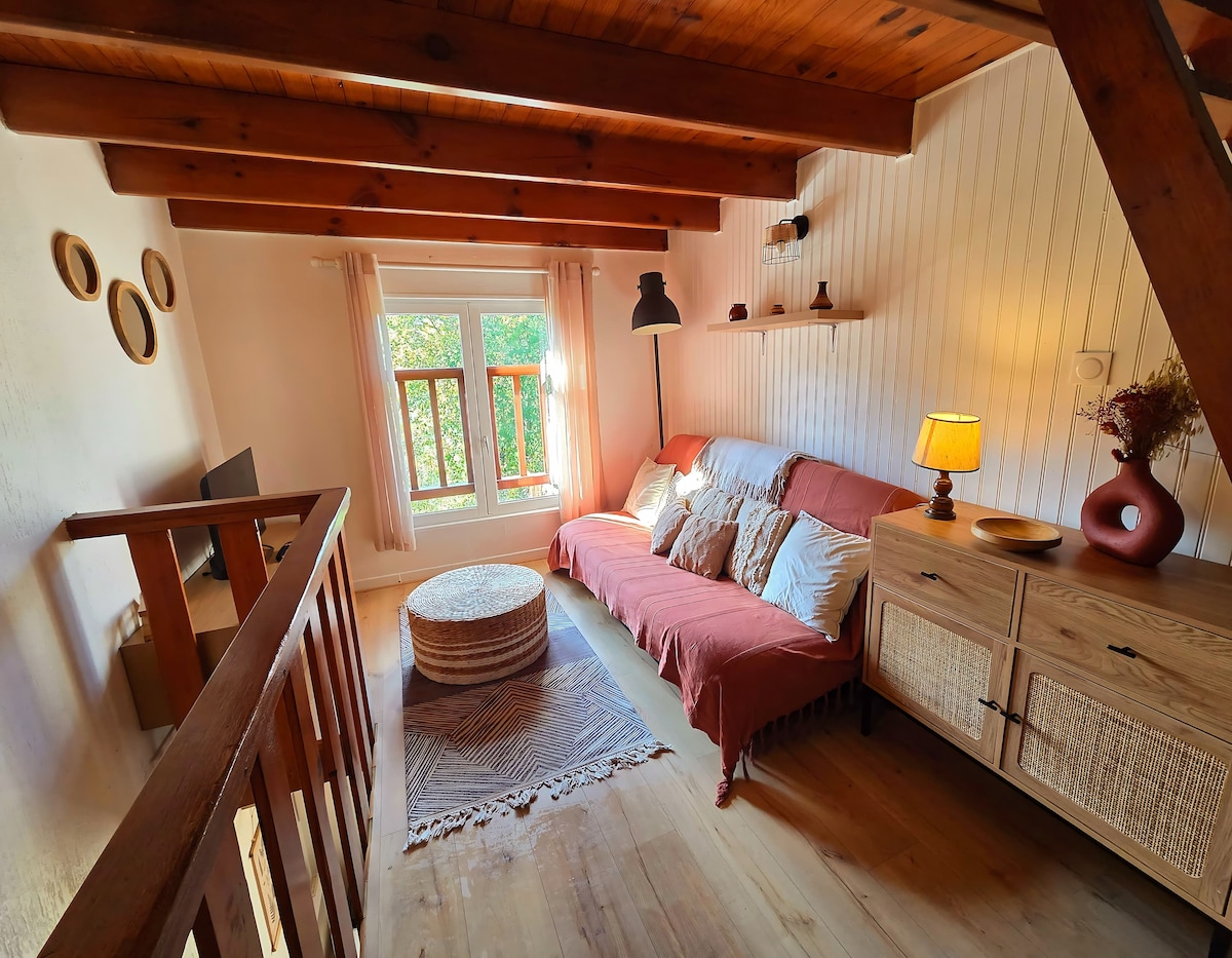 Gรฎte de 45 m2 : RDC : entrรฉe , placard, cuisine รฉquipรฉe: plaque รฉlectrique 4 feux, four , frigo , petit รฉlectromรฉnager , batterie de cuisine . coin repas avec table , chaises , buffet renfermant la vaisselle ; salon avec cheminรฉe รฉquipรฉe d'1 poรชle ร bois , canapรฉ convertible , bibliothรจque; salle d'eau avec douche , lavabo et radiateur sรจche serviettes ; wc indรฉpendant avec machine ร laver le linge planche et fer ร repasser . A l'รฉtage 1 chambre avec 3 lits de 90*190
