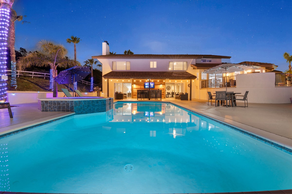 북부 샌디에고, 친환경, 가족 휴가 또는 친밀한 모임, 저녁 식사, 소규모 결혼식에 완벽합니다. 3개의 넓은 침실은 멋진 전용 수영장과 빌라를 둘러싼 하드스케이프로 연결됩니다. 태양열로 난방되는 지상 수영장과 프로판으로 난방되는 지상 스파에서 휴식을 취하세요. 바이킹 가전제품이 갖춰진 넓은 개방형 주방에서 영감을 받은 식사를 만들어 보세요.