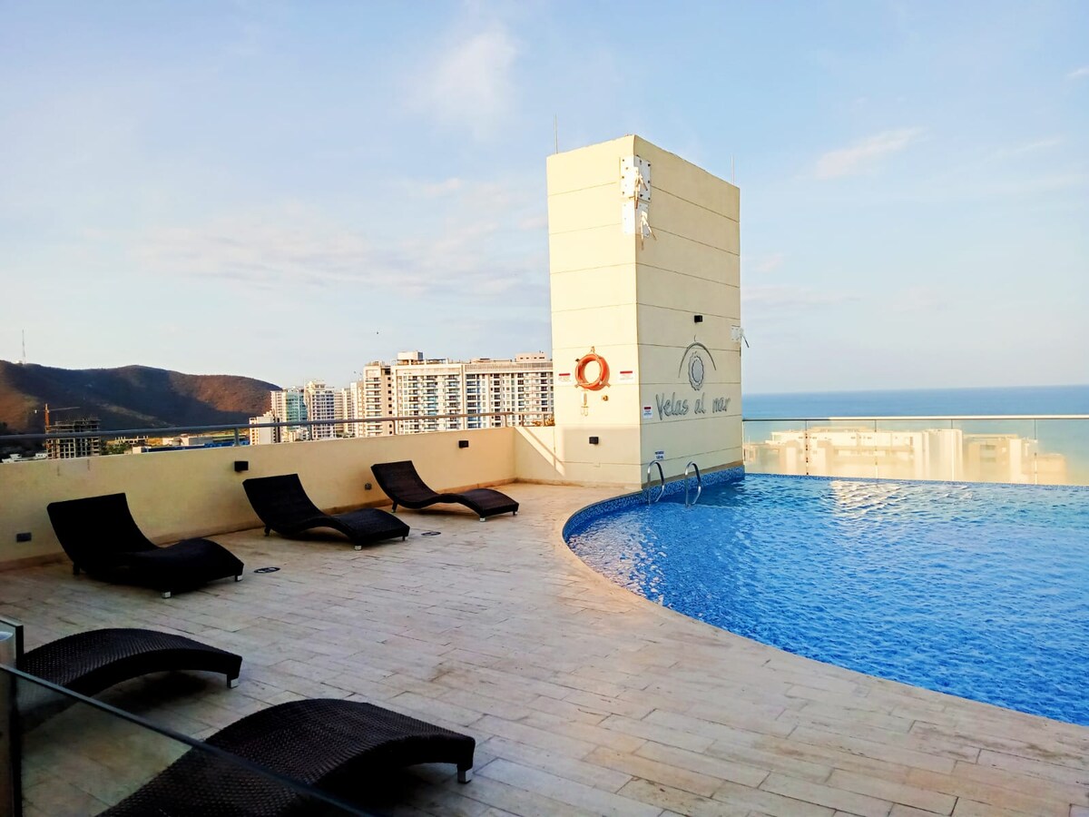 9th floor beautiful apartment in heart of Rodadero, Santa Marta. The kitchen has brand new Refrigerator, Freezer, Microwave, coffeemaker , sandwich maker.Spacious room with queen bed with puff , closet (hangers and clothes steamer), night stand, night lamp, mobile pc desk . Towels and Bedding included. Living room with full sleeper sofa bed. American bar with 4 modern stools. 2 bathrooms . Laundry area. security, lobby, 2 elevators , private parking, 15th floor ocean View pool & jacuzzi