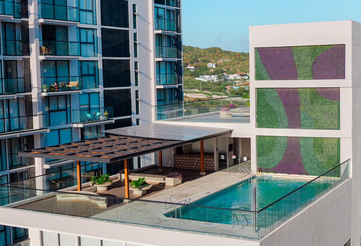 Aparta suite en Porto Horizonte piso 14, hermosa vista donde te relajarás en pareja, podrá disfrutar de un masaje en pareja en este Jacuzzi viendo el atardecer al fondo con el mar caribe de complice. Cama tipo queen con un TV 55’ donde podrás disfrutar tus series favoritas. La suite cuenta con cocina equipada para que puedas preparar un rico desayuno y te tomes un cafe en la mañana. Agua caliente y todo lo necesario para estar tranquilos. El edificio está equipado con una increíble piscina!