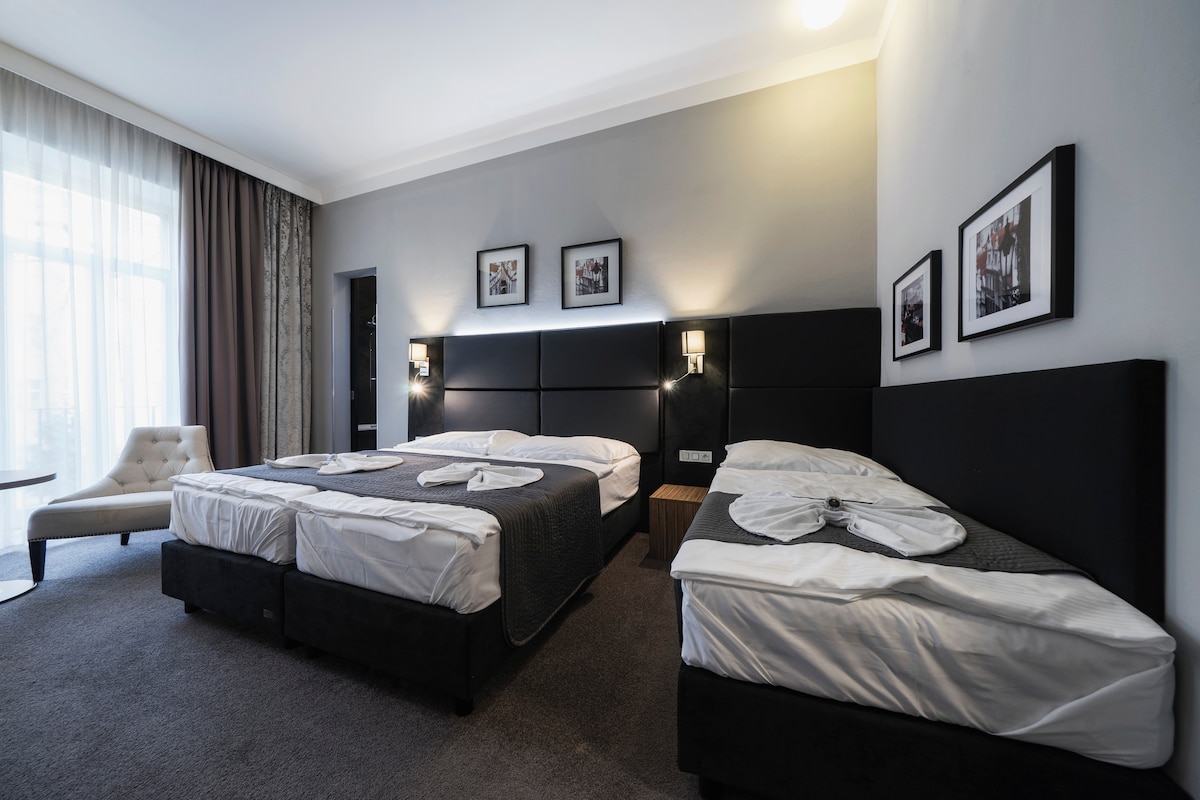슈페리어 쿼드러플룸은 최대 4명까지 사용할 수 있는 충분한 공간을 제공합니다. 유서 깊은 건물에 위치한 새롭게 리모델링한 호텔 누아르는 현대적인 디자이너 가구, 방음 창문, 커피 및 차 제조 시설, LCD TV를 갖춘 에어컨이 설치된 30개의 편안한 객실을 제공합니다. 매일 7:00 ~ 11:00 의 추가 비용으로 1인당 10유로로 아침 식사를 제공합니다.