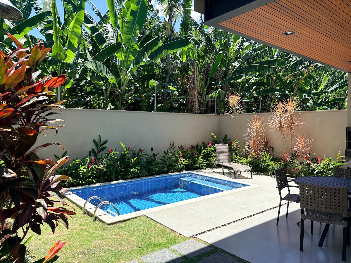 Casa térrea super bem decorada com piscina, 2 decks, espreguiçadeiras, churrasqueira e um lindo jardim. São 4 quartos (2 suítes) com ar, toalhas e lençóis lavados em lavanderia. Wifi que pega na casa inteira! Sala espaçosa com smart TV, Sky, ar condicionado e duas mesas, para refeições e jogos, e ambas ótimas pra trabalhar. Cozinha com todos os utensílios. O checkin é simples e remoto. A praia, muito tranquila, fica a 90 metros da casa. Anfitriões eficientes e atenciosos!
