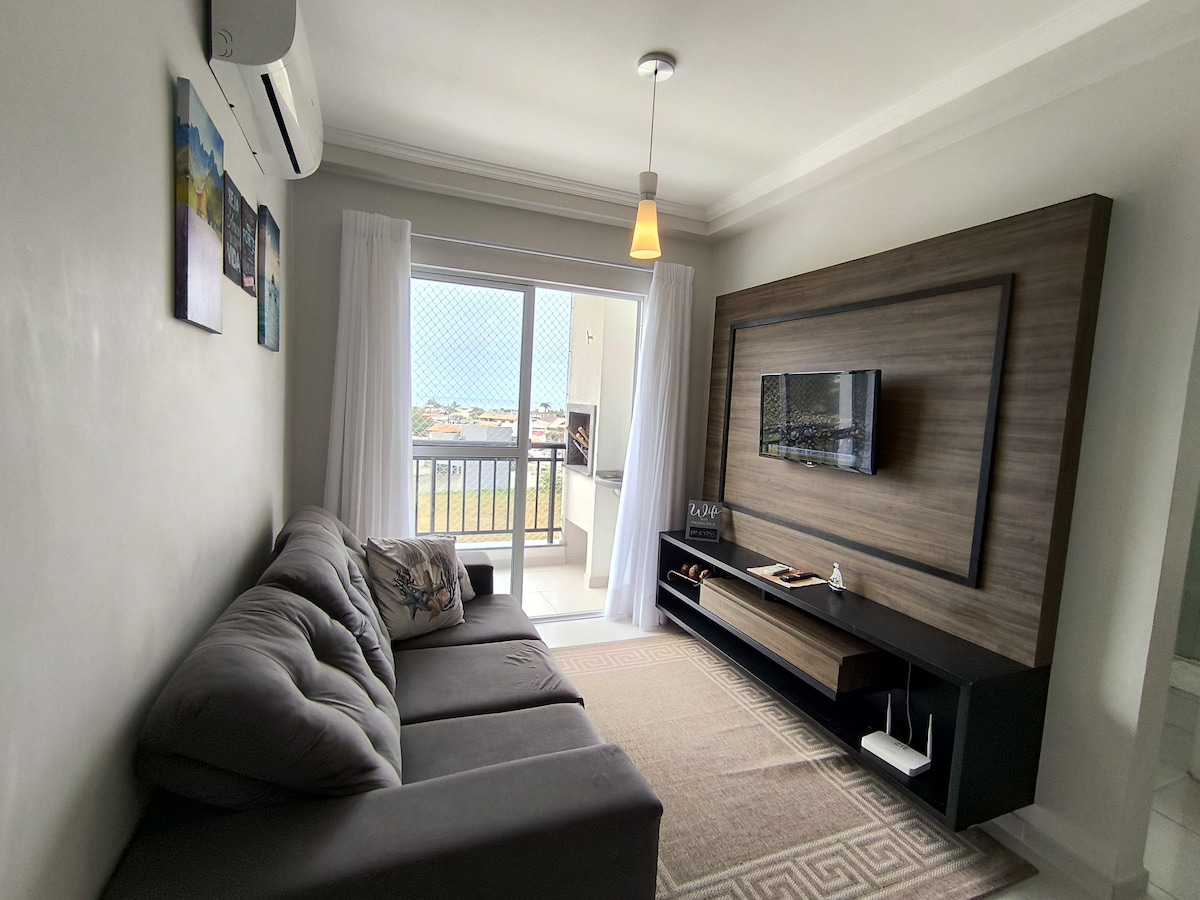 Apartamento com linda vista do mar. Rede de proteção em todas as janelas. Wifi própria. Ar condicionado em todos os ambientes. 2 quartos que acomodam até 4 adultos (18+) e 2 crianças com colchão. TV Smart 42 na sala. TV Smart 32 na suíte. Totalmente mobiliado com eletrodomésticos, utensílios de cozinha. Roupas de cama e banho. 1 vaga de garagem coberta próximo a porta. Localizado em belo condomínio, com piscina, academia, playground, sala de jogos, quadras de areia e grama, segurança 24hrs.