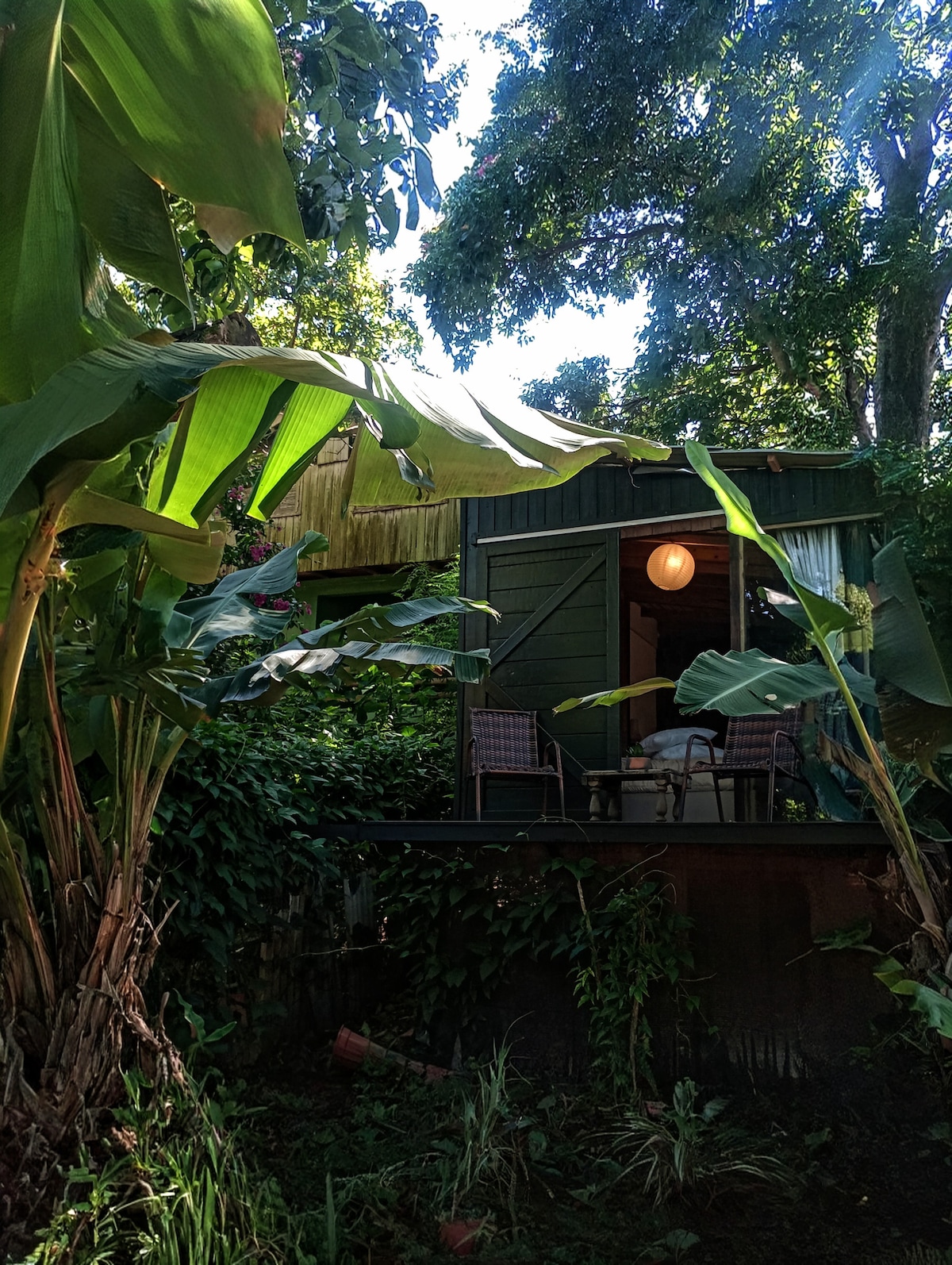 A suíte para 2 pessoas oferece ar condicionado e uma mini cozinha equipada com fogão elétrico de uma boca, frigobar, micro-ondas e chaleira elétrica. O espaço inclui TV, Wi-Fi, e um banheiro privativo. A sacada, acessível por escada, é exclusiva para o hóspede e vem com uma rede para relaxar.