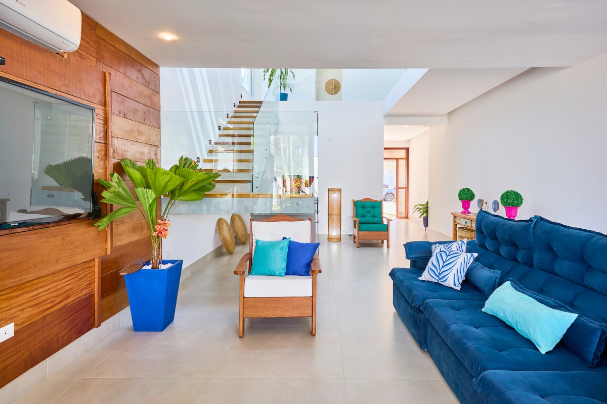À 2 minutos a pé da areia. O condomínio SALGA é direto na praia, segurança 24 h, monitoramento e ronda. Casa Térrea com 3 quartos e 3 banheiros, sendo 2 suítes. 12 lugares em camas + 2 colchões avulsos. Varanda integrando jardim, churrasqueira, salas de estar e jantar proporcionando sensação de amplidão. Pé direito alto com 3 m. altura. Ambientes limpos e bem arejados. Ventiladores de 3 velocidades em todos ambientes. Filtro de água na cozinha. Plano de Internet e WIFI ilimitada - de 500 Mb.