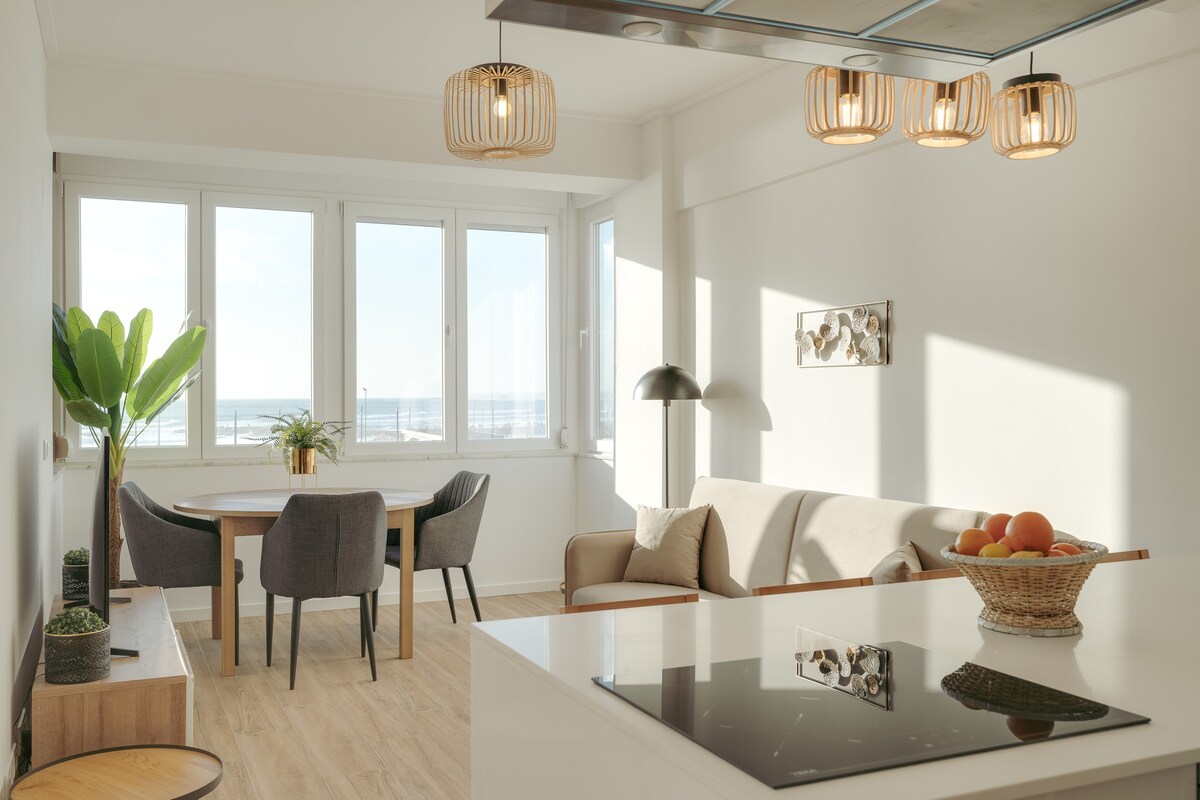 Apartamento reconstruído por arquitecto, excelente privacidade, exposição solar, com wifi, e praia a 150m. 1 suite com SPA e banho turco com aromaterapia. 1 suíte com terraço com vista mar, tela de projeção de cinema. Sala com vista de mar, rio, e terraço, onde poderá disfrutar de uma zona de estar e de um barbecue com grelha em ferro forjado. Perto de restaurantes, cafés e supermercado, e estação de comboio. Ar condicionado e piso aquecido em todas as áreas, TV 4K e box independente por suíte.