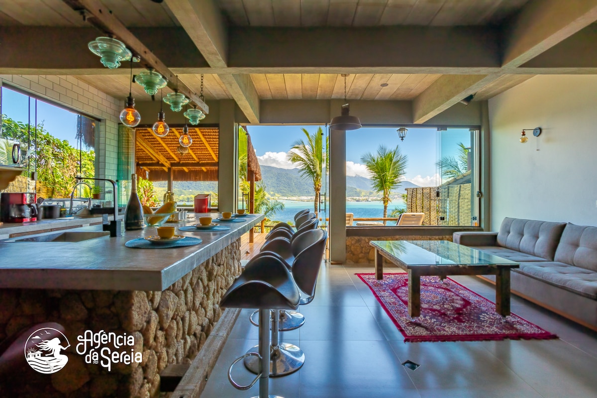 Casa em condomínio fechado na Barra do Sahy com 400m2, 4 suítes, 1 lavabo e capacidade de acomodar 8 pessoas confortavelmente. A casa está em ótima condições e é extremamente charmosa, espaçosa e bem decorada, com uma vista fantástica de todos as salas e quartos para a praia. É uma casa bem arejada e fresca pois possui pé direito alto e janelas de vidro grandes ao redor de todo o ambiente. Terraço com piscina, churrasqueira e mesa externa. Segurança 24h. Wifi fibra ótica de alta velocidade.