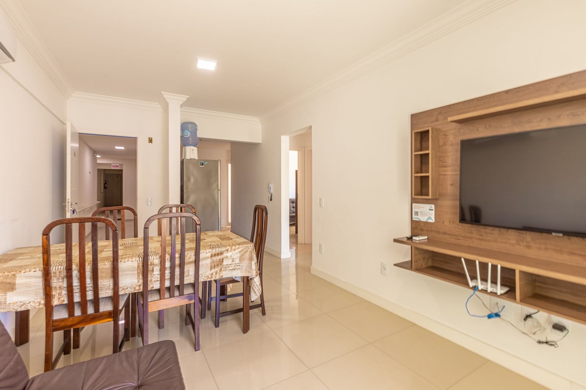 Modern and cozy apartment located in Residencial Sunny Flats, approximately 400 meters from Bombas beach in Bombinhas. It has a beautiful outdoor area with a swimming pool on the terrace, gourmet area, fire pit, games room, and kids' area. It has an integrated living room and kitchen with a dining table, a guest bathroom, 1 air-conditioned bedroom, a sofa bed in the living room, and a balcony with a private barbecue.