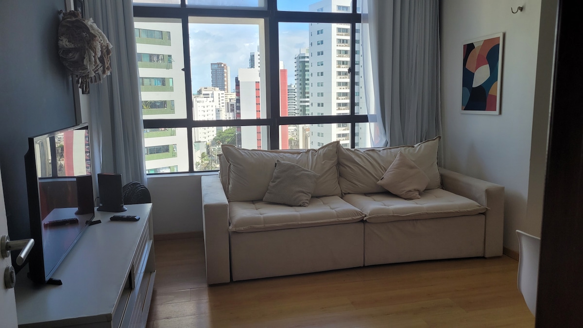 O Flat está em uma excelente localização, em um dos bairros mais nobres de Recife, Pina, à metros do Shopping Rio Mar, cofre,quarto e sala, com cama de casal e sofá-cama na sala, fogão com forno, microondas, 2 ar condicionados (Split), 2 Tvs, wifi 100M, armário, espelho, mesa de jantar e de trabalho, utensílios e eletrônicos de cozinha, panelas etc, secador de cabelo, peças de cama e banho. Mobiliado, vaga de garagem, academia, restaurante, piscina, sauna e rooftop. Lindíssima vista do Recife.