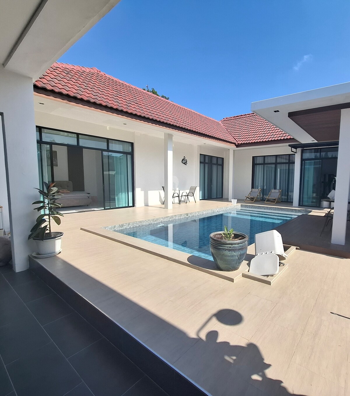 프란부리 해변에서 몇 분 거리에 있는 평화로운 침실 3개의 수영장 저택에서 도시를 벗어나 휴식을 취하세요. 아레야 리트리트는 전용 수영장, 수영장 테이블, 완비된 주방, 밝고 자연 채광이 들어오는 거실 공간을 제공합니다. 빠른 와이파이를 통해 휴식을 취하거나 원격으로 일하기에 완벽한 숙소입니다. 바다에서 1.3km 거리에 위치해 있으며, 편안함과 평온을 찾는 가족, 그룹 또는 커플에게 이상적입니다. 주간 및 월간 숙박에 대해 15~30% 할인 혜택을 누리세요.
