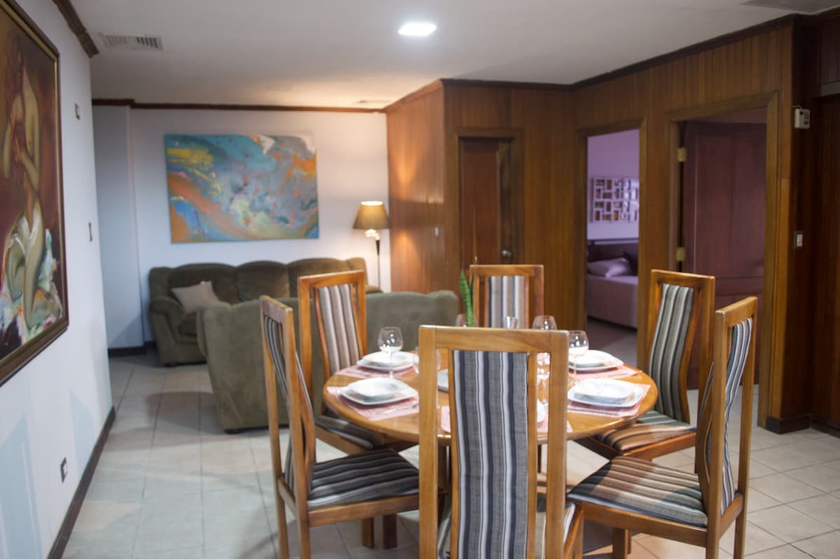 산호세 시내에 위치한 현대적인 아파트(1300평방피트 크기). 훌륭하고 안전한 위치. 도보 거리에 레스토랑, 상점, 펍, 슈퍼마켓 등 다양한 장소에 접근할 수 있습니다. 무선 연결 + 초고속 인터넷(100MGB) 건물 4층에 위치해 있어 낮과 밤 모두 멋진 전망을 감상할 수 있습니다. 아파트에는 시설이 완비되어 있습니다. 온수. 2개의 방 각각 퀸사이즈 침대 1개, 3호 객실에는 1인용 트윈 침대 1개가 있습니다. 거실에는 슬립 코치가 하나 더 있으며, 케이블 TV도 갖추고 있습니다.