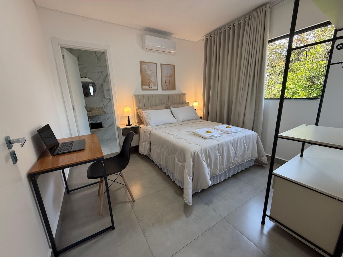 이 아늑하고 안전하며 위치가 좋은 숙소에 머무르면 가족이 모든 것에 가까이 있을 것입니다. 포스 도 이구아수 중심부에 위치한 스튜디오로 주요 관광지, 빵집, 쇼핑몰, 슈퍼마켓, 쇼핑 센터 및 레스토랑에서 가깝습니다. 최대 7명까지 수용 가능한 객실: - 더블 침대 2개 - 소파 베드 1개 - 추가 매트리스 1개 - 테이블 및 의자 - 와이파이 - 크롬 캐스트가 있는 TV - 에어컨 - 전용 욕실 주방: 싱크대, 냉장고, 쿡탑, 전자레인지, 식기. 무료 주차.