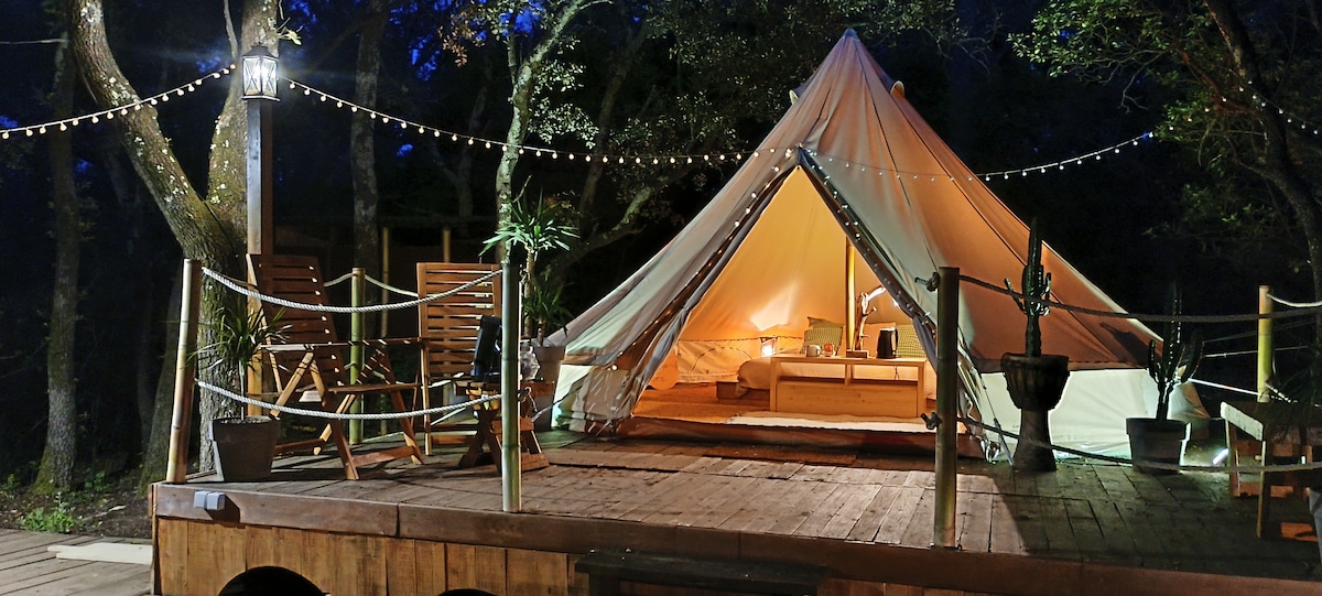 - 4월부터 이용 가능 - 안녕하세요! 700m 높이의 아르데슈에 위치하고 있으며, 그림 같은 마을까지 도보로 최대 10분 거리에 있습니다. 파노라마 전망을 감상할 수 있는 컴포트 사하란 텐트 아래에서 더블 침대와 싱글 침대 3개까지 편안한 하룻밤을 보내실 수 있습니다. 침구와 타월을 계획하세요 (대여 가능). 여름 주방이나 푸드트럭에서 직접 식사를 즐겨보세요.