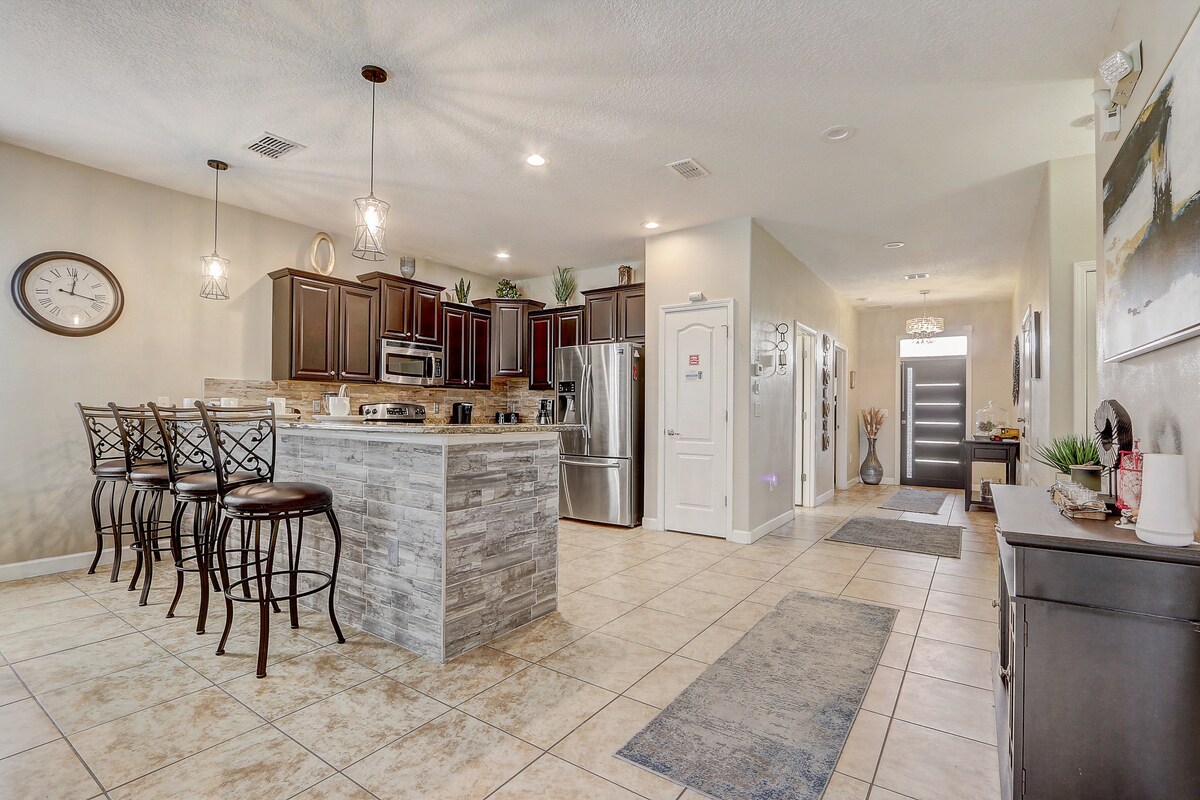 온 가족이 즐거운 시간을 보낼 수 있는 공간이 많은 리조트 스타일의 숙소에 머물러보세요. 숙소에는 플로트, 라운지 의자, 야외 식사 및 가스 그릴이 있는 전용 스크린 수영장이 있습니다. 내부에는 침대 6개, 욕실 3개, 전용 사무실 공간 및 게임이 있는 침실 4개. 이 커뮤니티에는 헬스장, 2개의 수영장, 놀이터, 2개의 테니스 코트, 18홀 프로 골프 코스가 있습니다. 디즈니월드에서 25분, 유니버설 스튜디오에서 40분 거리에 있습니다. 미국 최고의 해변에서 즐거운 하루를 보낼 수 있는 편리한 출퇴근.