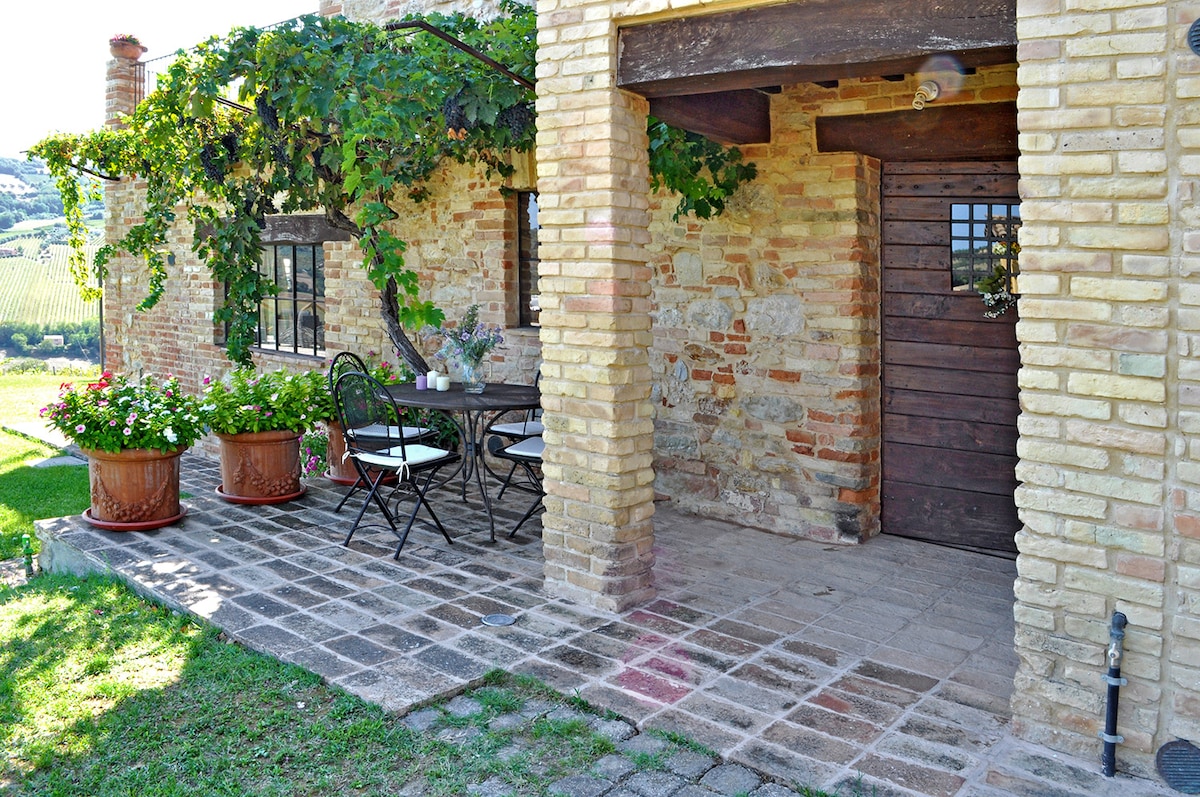 The GrazieSole farmhouse is a recently renovated 20th-century farmhouse, characteristic style with stone walls, exposed brick and wooden beams. It features a 12-meter swimming pool with breathtaking views and a sweeping panorama that extends from the Sibillini Mountains to the surrounding hilltop villages. It is located in the open countryside, one kilometer from the center of the village of Penna S. Giovanni, in a sunny and quiet location, surrounded by a garden and large green spaces.