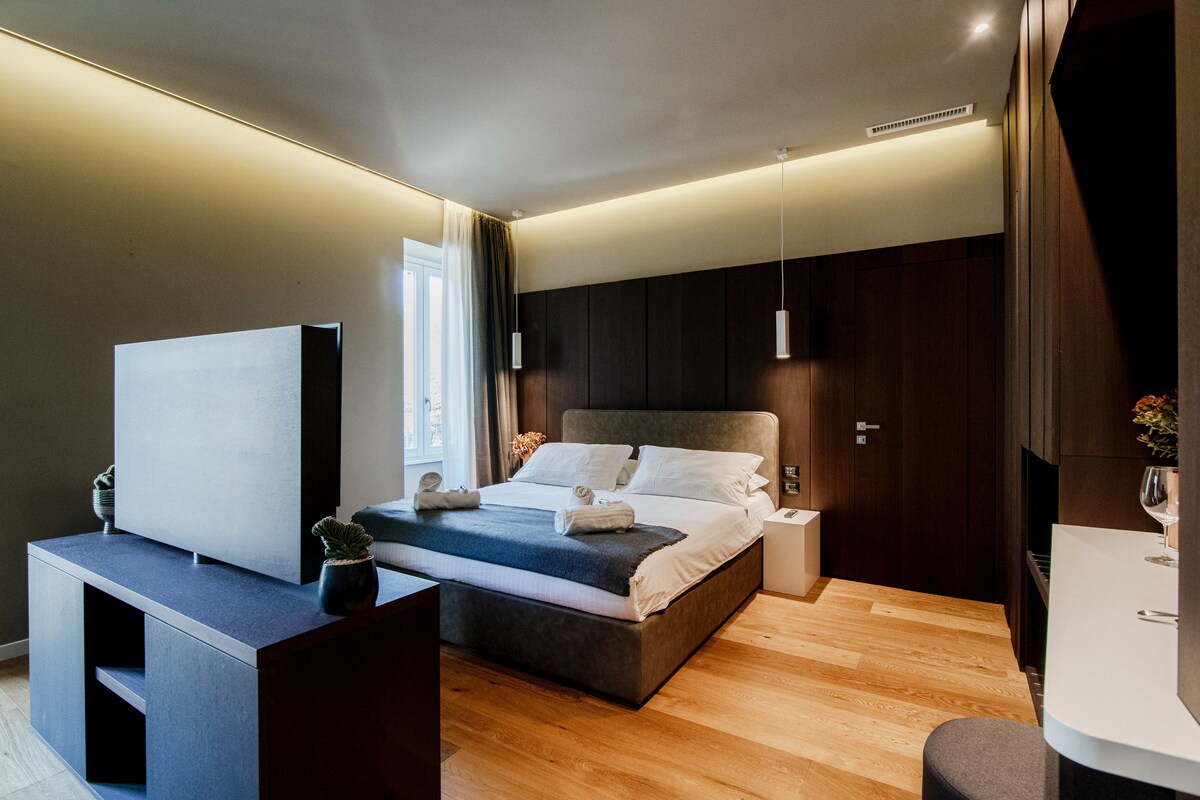Questa suites arredata con uno stile inconfondibile per il tuo soggiorno in relax, dispone di una vasca idromassaggio doppia, Sauna privata, Tv satellitare, WIFI, frigobar e le comodità di cui necessiti per stare al meglio. Sei nel cuore della città, posizione perfetta e devi solo pensare a goderti il tuo tempo. Non c’è altra sistemazione a Como città studiata per essere perfettamente a poca distanza da tutto, a piedi e che abbia la vasca idromassaggio e i confort di questa Suite.