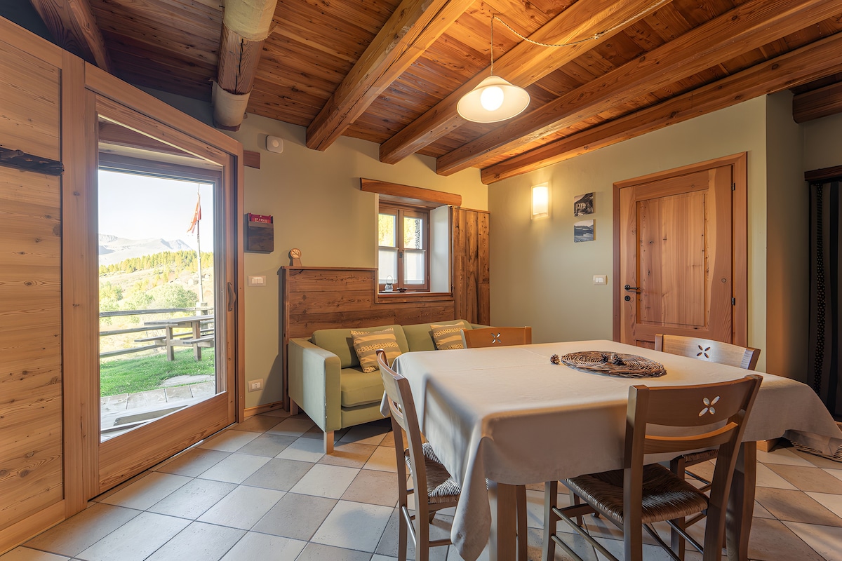 Access the accommodation by walking through the small hamlet and climbing the steps to the second level of the stone portico on the south side of the building. The elevated position of the apartment offers a beautiful view from the balcony of the Col d’Esischie peaks and the dense larch forest. The accommodation is spread over two levels: the first features a comfortable living area with a modern kitchen equipped with an electric cooktop, refrigerator, sink, and dishes.