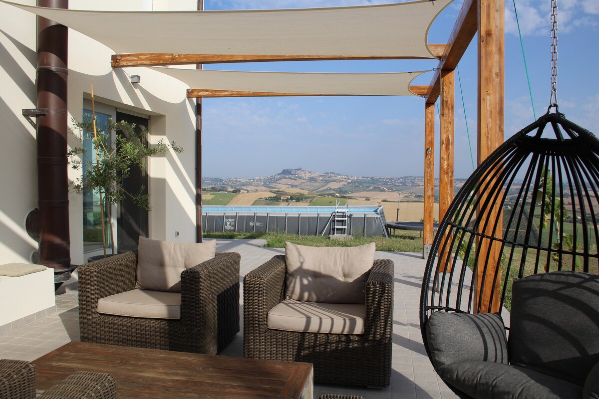 Independent Junior Suite in the hills of Le Marche, designed for guests seeking privacy, nature, and a slower pace, without giving up comfort and attention to detail A studio apartment with private entrance, kitchen, bathroom, and private garden. French-size canopy bed for an intimate and cosy stay Shared panoramic swimming pool (max 8 guests) and organic breakfast prepared fresh every morning included. Ideal for couples, friends or solo travellers looking for a peaceful countryside stay
