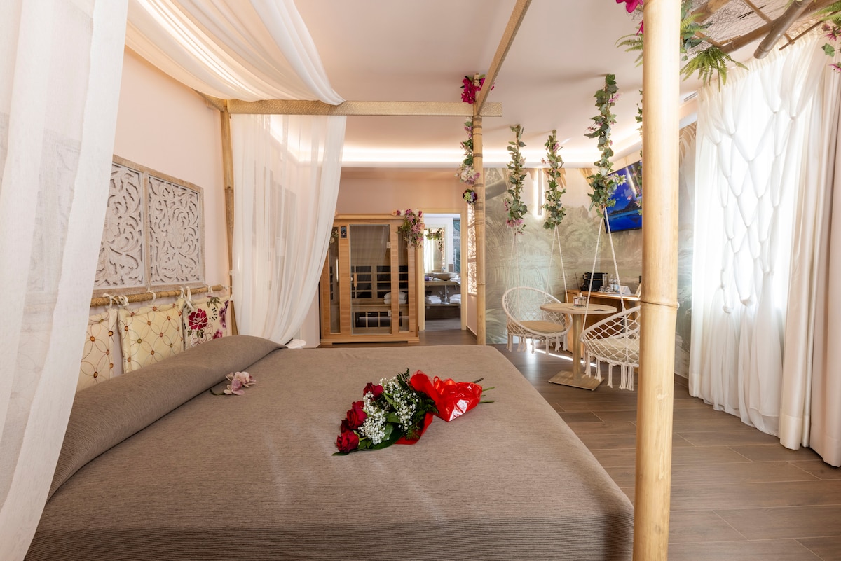 "Mille e Una Notte" 스위트는 동양적이고 동화 같은 분위기를 떠올리게 합니다. 로맨틱한 동화에 푹 빠진 것처럼 숙박을 경험할 수 있습니다. 벽, 킹사이즈 침대 구성, 드레이프형 천장, 모든 것이 동명의 책에서 스위트에 이르기까지 동화 속 중심지인 사마르칸드 시의 아시아적 맥락을 연상시킵니다. 이 아라비아 배경으로 둘러싸여 객실 내부의 자쿠지 욕조에서 편안한 목욕을 즐길 수 있습니다.